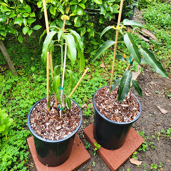 UPDATE: April 2026 - I've transplanted the two mangos into new pots with custom potting soil mixture (coconut coir and chips, perlite/sand, and added some compost):